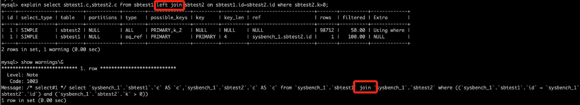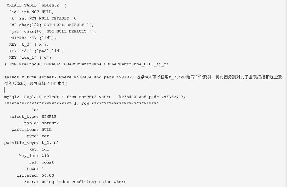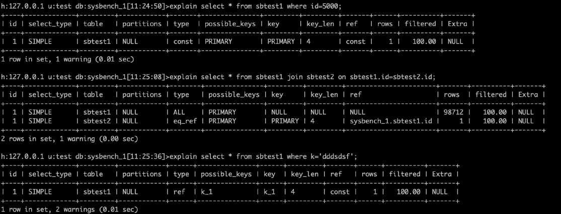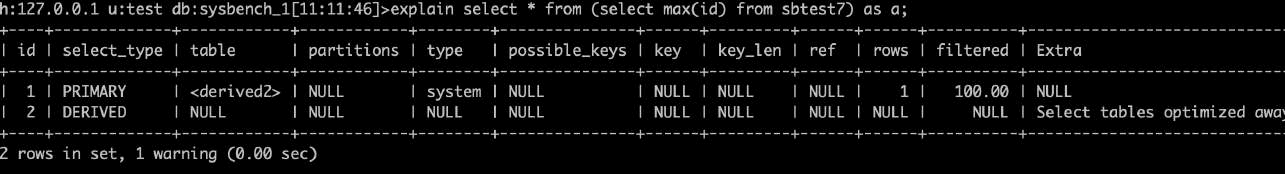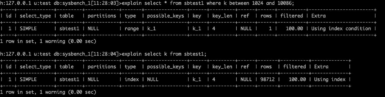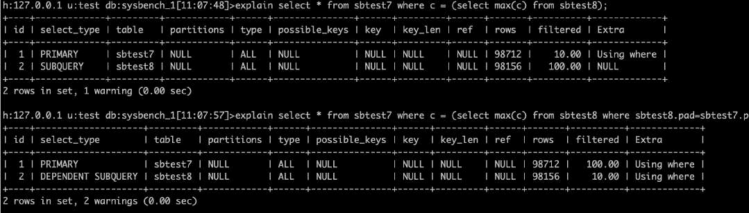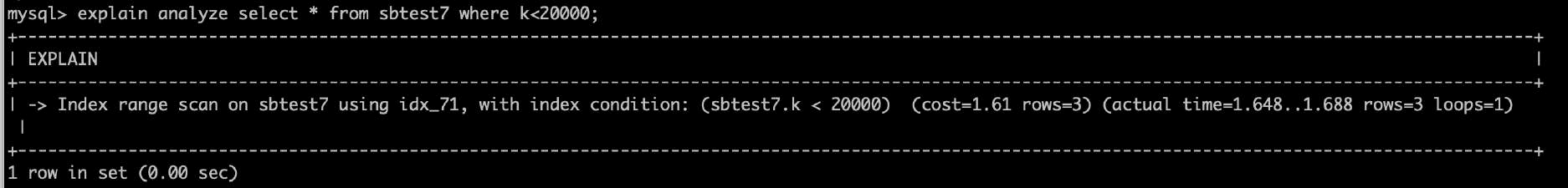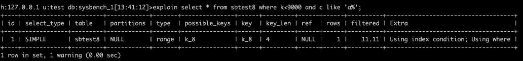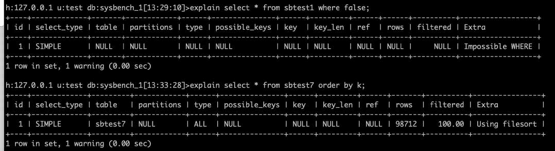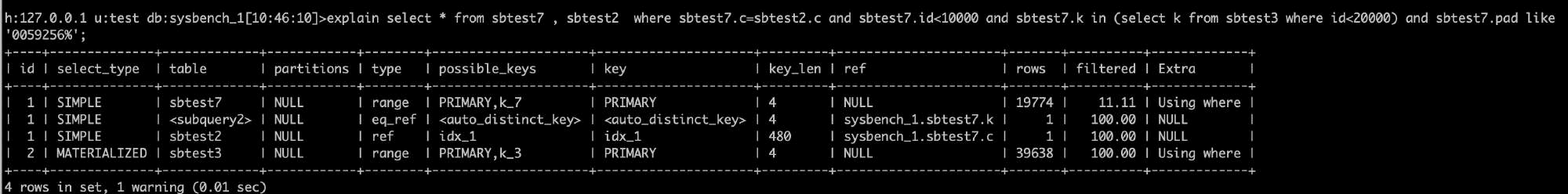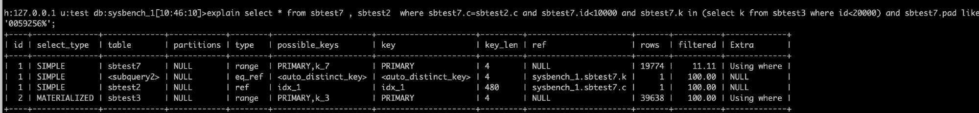•Filtered:扫描的行数中符合其他条件的比例。下图sbtest7主键扫描19774条记录中,预估11.11%满足其他条件