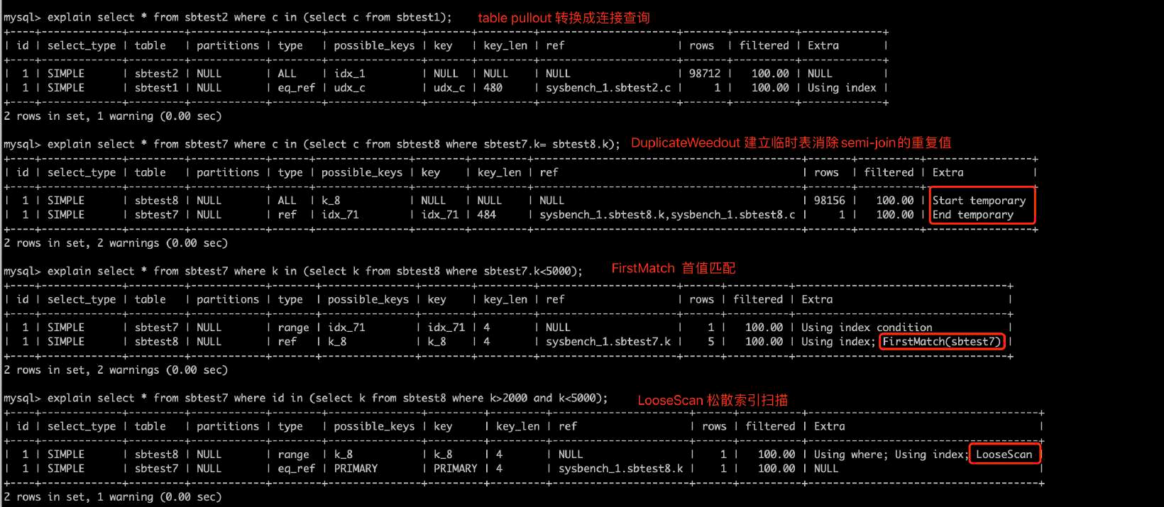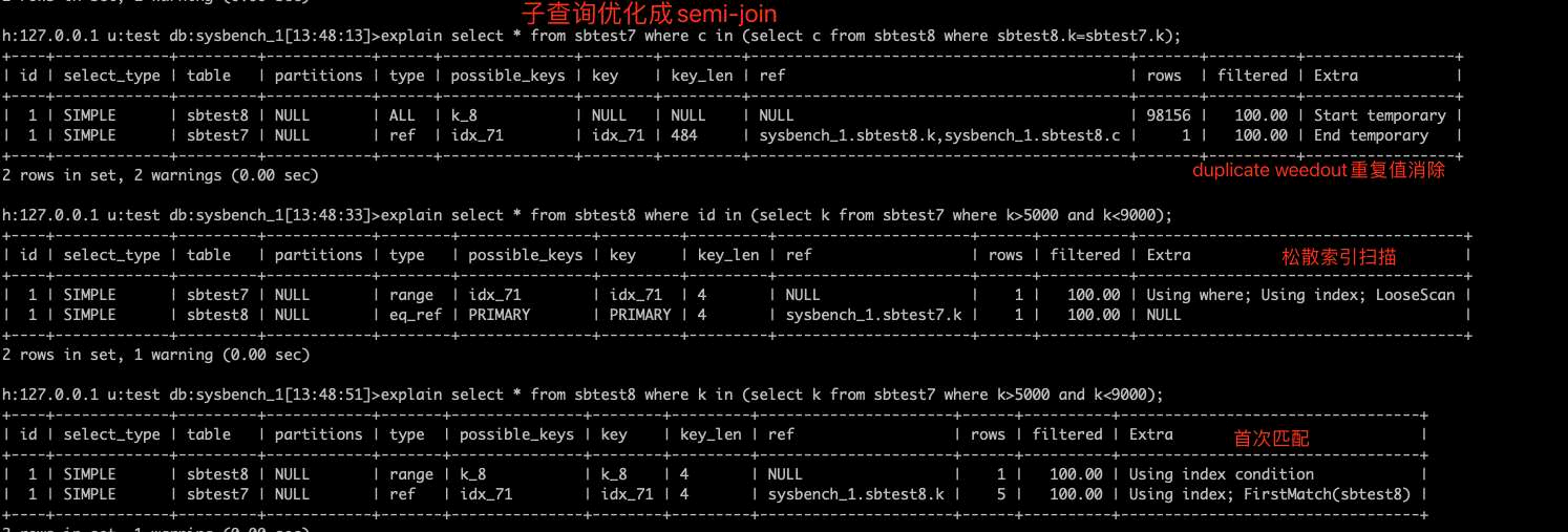 子查询优化:某些符合条件的 in 子查询MySQL会优化成成semi-join的方式执行https://dev.mysql.com/doc/refman/8.0/en/semijoins.html