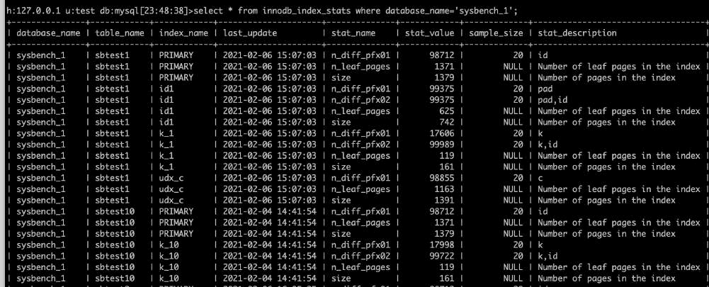 • innodb_index_stats存储索引的统计信息,包括叶子节点page数,索引总page数,索引中不重复值的数量(组合索引分别统计),采样的页面数。