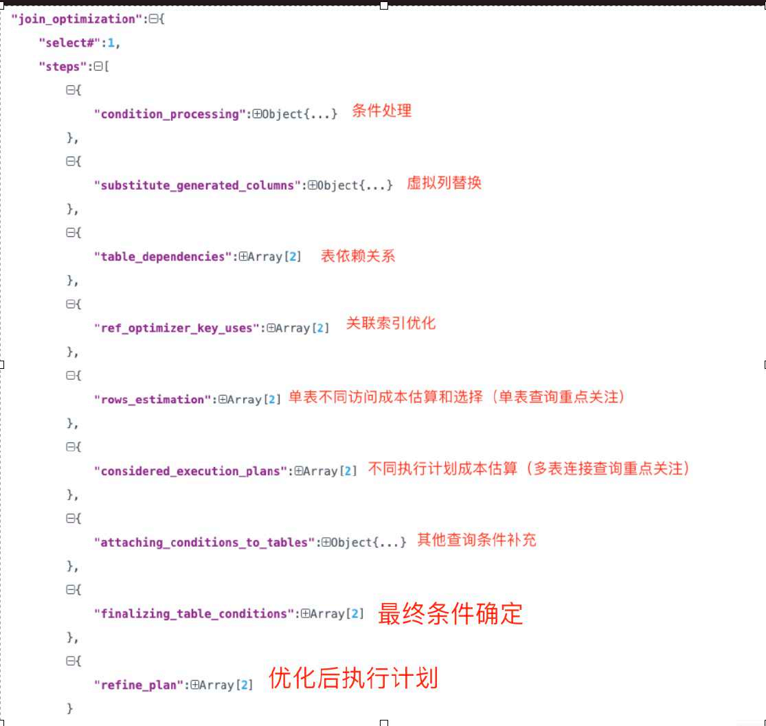 •optimizer trace结果主要分为join_preparation准备,join_optimization优化和join_execution执行三部分;
