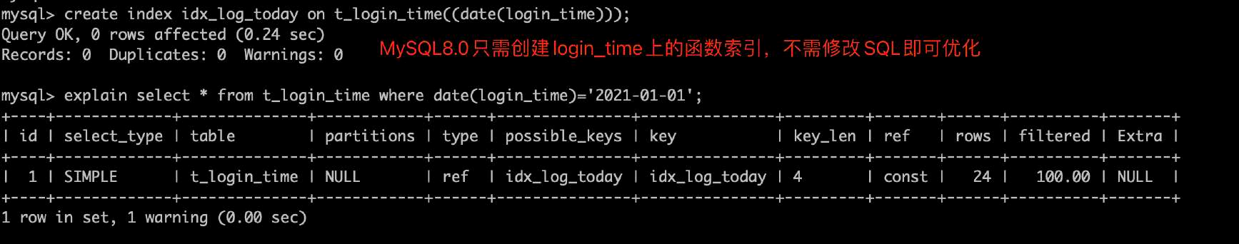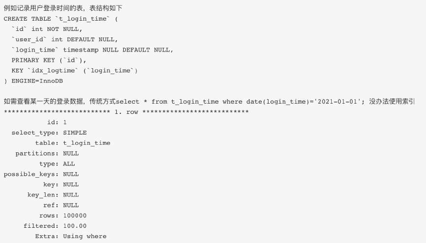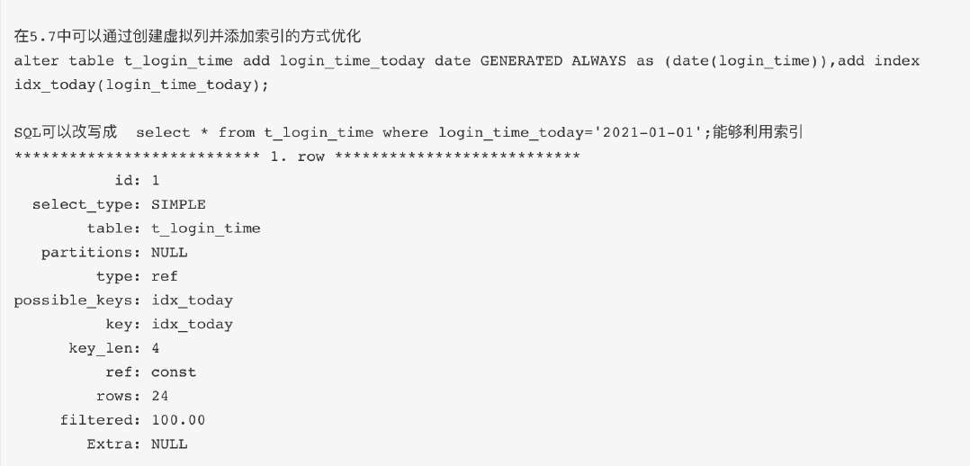 •某些场景,可以考虑采用虚拟列并创建索引或使用函数索引的方式,优化SQL避免全表扫描
