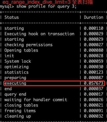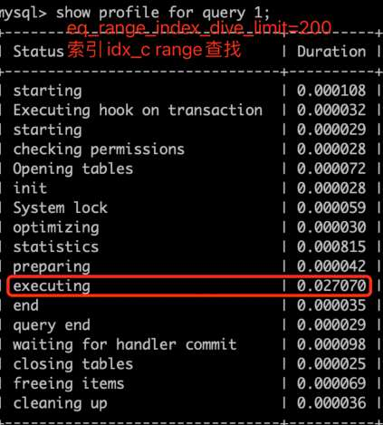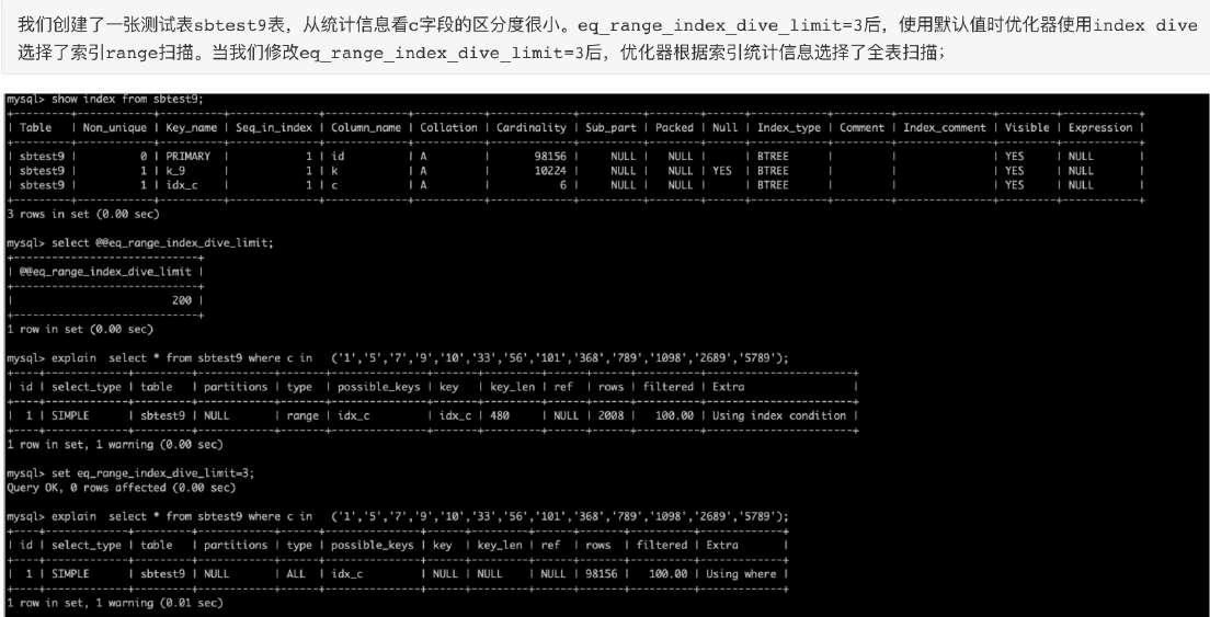 •where 子句in()中条件较多时,需适当调整eq_range_index_dive_limit参数值;该参数默认值是200,当单点区间超过200时MySQL优化器将放弃index dive而使用索引统计数据估算成本,可能会基于不太准确的统计数据选择不合理的执行计划;
