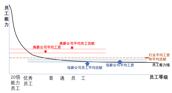 大部分公司都必须比照行业平均工资水平,才能够找到合适的人,虽然整个行业的平均工资水平和员工平均贡献是匹配的,但由于20倍能力的人不用20倍工资就可以得到,这就导致了,任何一家公司只要能找到20倍能力的人,整个工资的平均人力成本就会低于员工的实际贡献;如果找不到这样的人,你的人力成本就会高于员工的贡献,如下图所示: