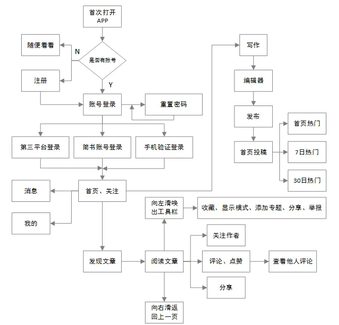 本文“简书”移动端为例,按照上图的总结写一份简单的PRD文档框架,希望能帮助同为“简书”用户的大家更好地理解。(PM菜鸟一枚,简书新用户,重文档轻分析)。