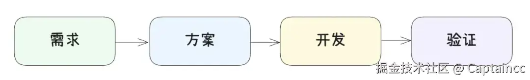 下面我们重点要分析一下,Cursor 到底改变了传统编程的什么环节,我们也好重点发力。我们在面对一个复杂任务时都可以拆为以下四步:确认目标、确认方案、开发以及验证。Cursor 的到来最大的改变就是:在需求阶段的表达方式,即如何与 AI 沟通。