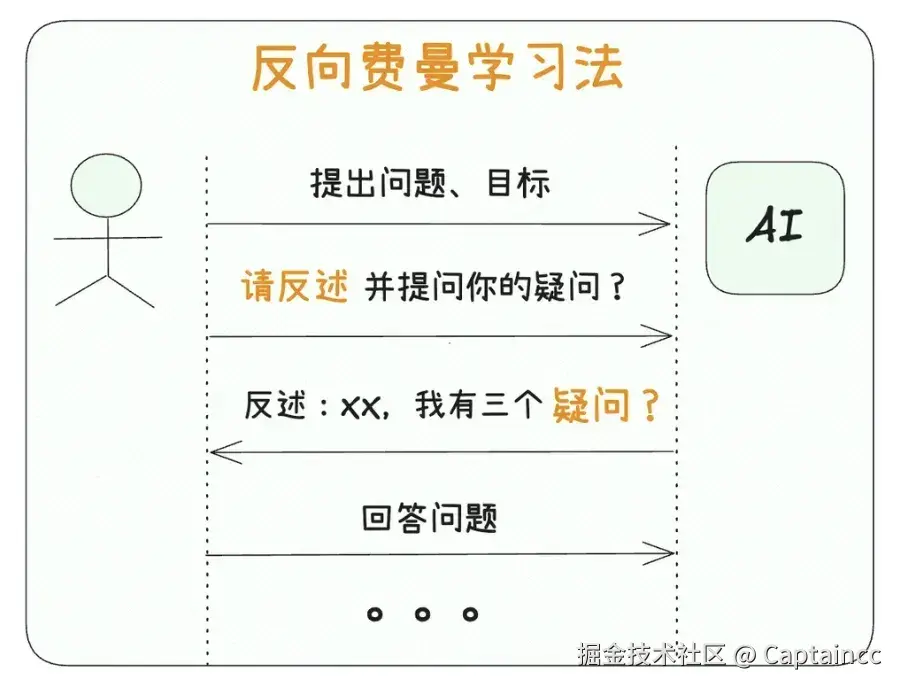 我们把这种模式迁移一下,那对于 AI 来说,当你提出了一个问题,想想:他真的懂了吗?让 AI 反述一遍,你听听如何?但是光这个就够了吗,不够,你还需要让 AI 具有质疑精神,让他对你的问题提出质疑,而不是全盘接受!反向逼迫你去思考什么是“真需求”让 AI 变成你思维的“延展”。我把这种模式称之为: 反向费曼学习法。