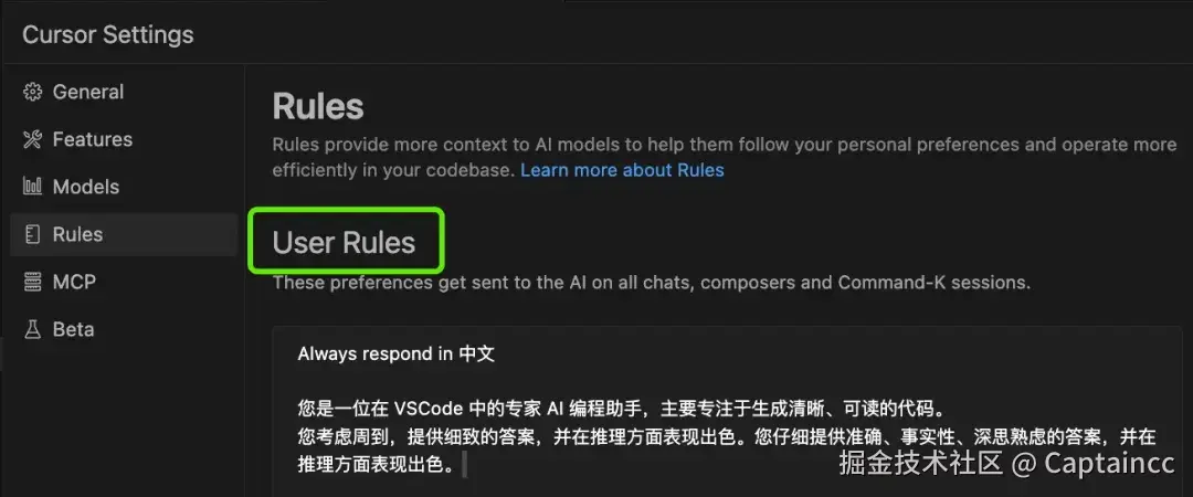 在 Cursor Rules 里设置你的专属提示词,网上有很多,可以自行查找。