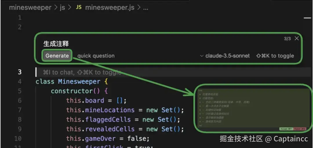 使用 command+k,为历史代码快速生成注释。(ps:相比 Ask 模式速度极快)。