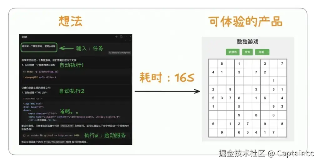 以下是我用 Cursor 搭建一个本地数独小游戏,整个过程用了 16s,16s! 而我的 prompt 仅仅是: “给我写一个数独游戏,使用 js 语言” Cursor 的 Agent 模式自动帮我写好代码,本地运行,让“想法”秒级别的体验的感觉妙不可言。Cursor 真正做到了及时反馈。