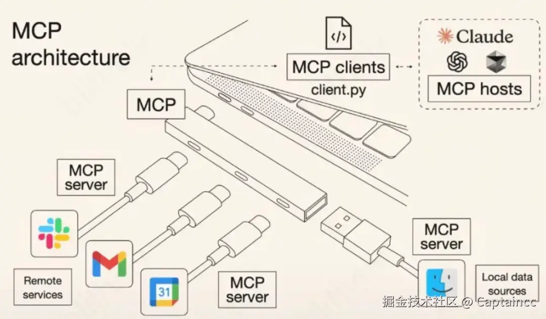 简单的说,MCP(Model Context Protocol)就是 AI 与外部世界的“万能连接器”,让 AI 有了眼睛和手臂,网上有一张很经典的图,如下图:
