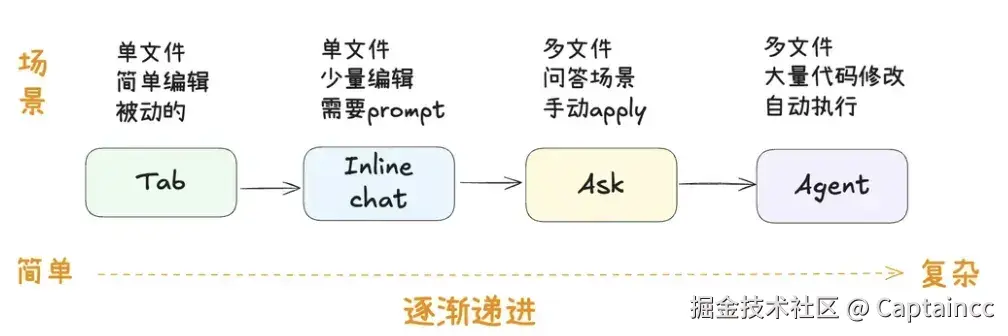 首先我们需要了解 Cursor 为我们在不同的场景提供了不同能力支持,从简单场景到复杂场景一次是:Tab、Inline chat、Ask 以及 Agent。(ps:Ask 对应老版本的 Chat;Agent 对应老版本的 Composer,更详细的内容可见:www.cursor.com/ )