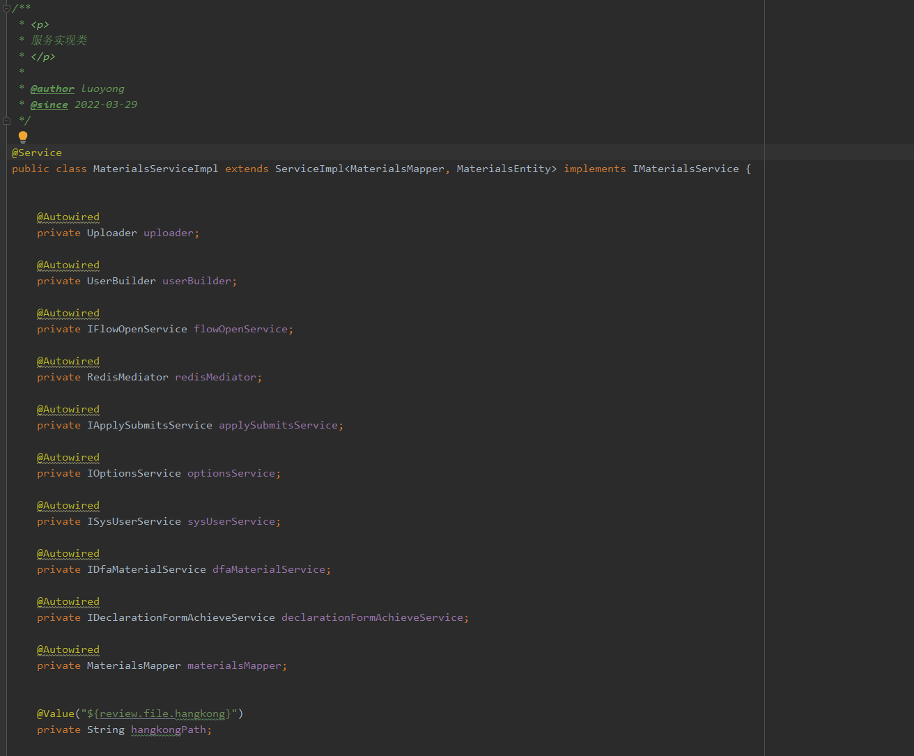 - @Service注解被放置在类定义之前,表明这个类是一个服务组件,应该被Spring容器自动检测并注册为一个Bean。