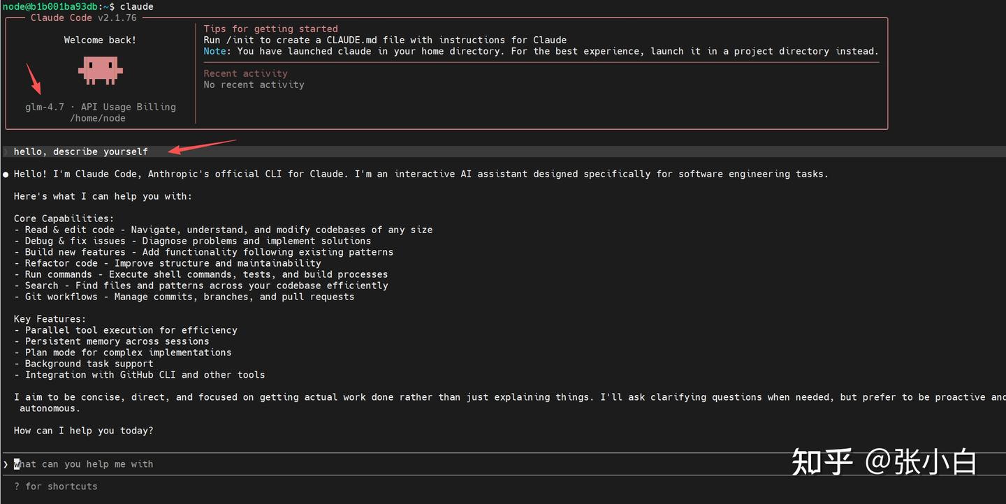看来Claude Code自己启动是OK的(调用了GLM Coding Plan的glm-4.7)。