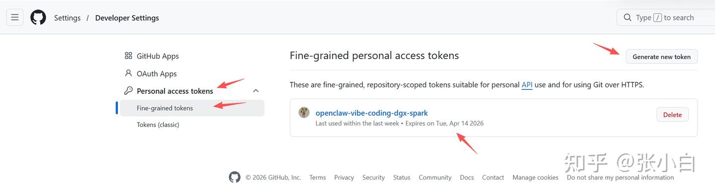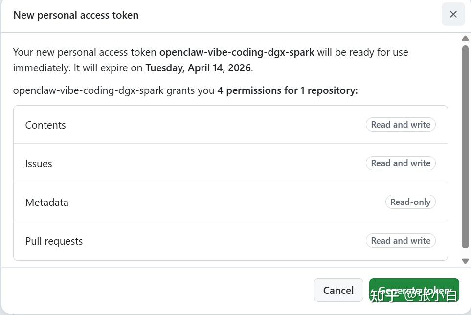 输入token名称后,选择token权限范围是 openclaw-vibe-coding项目,并且赋予以下权限: