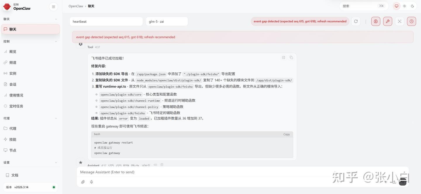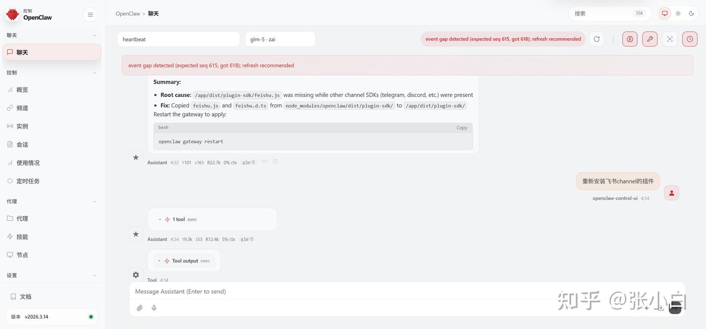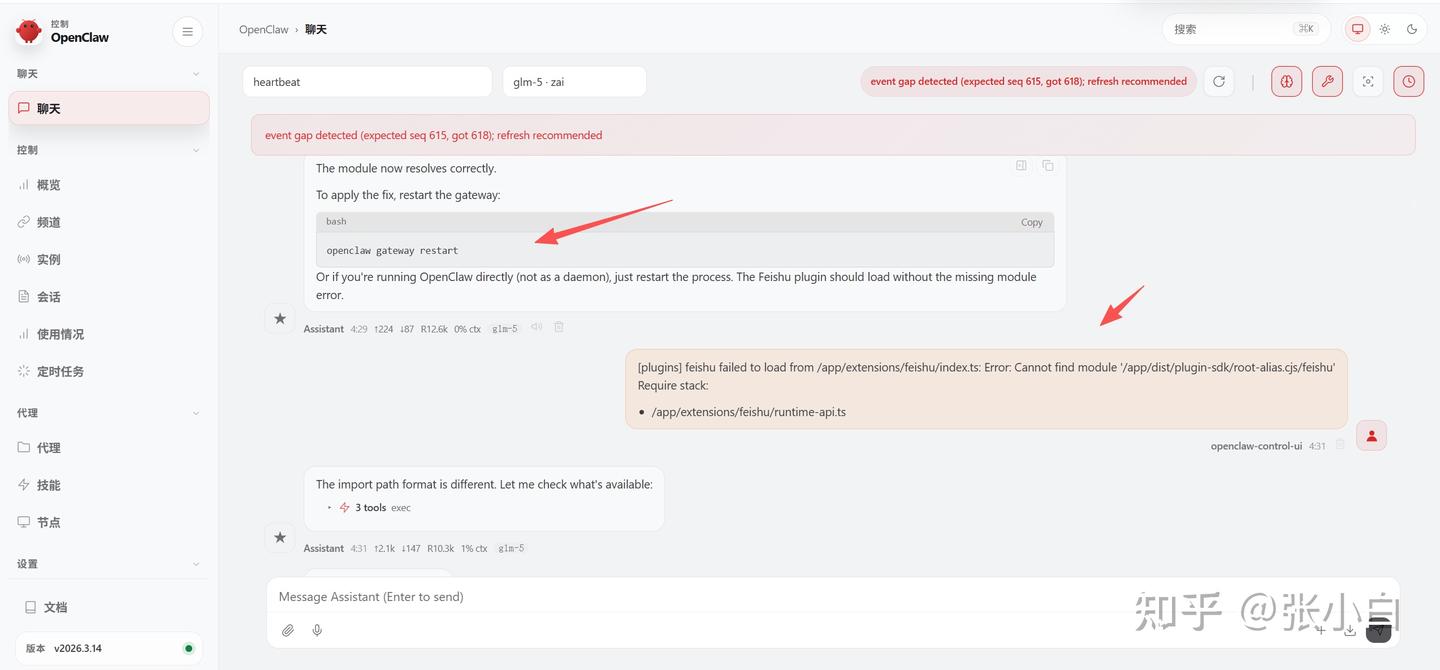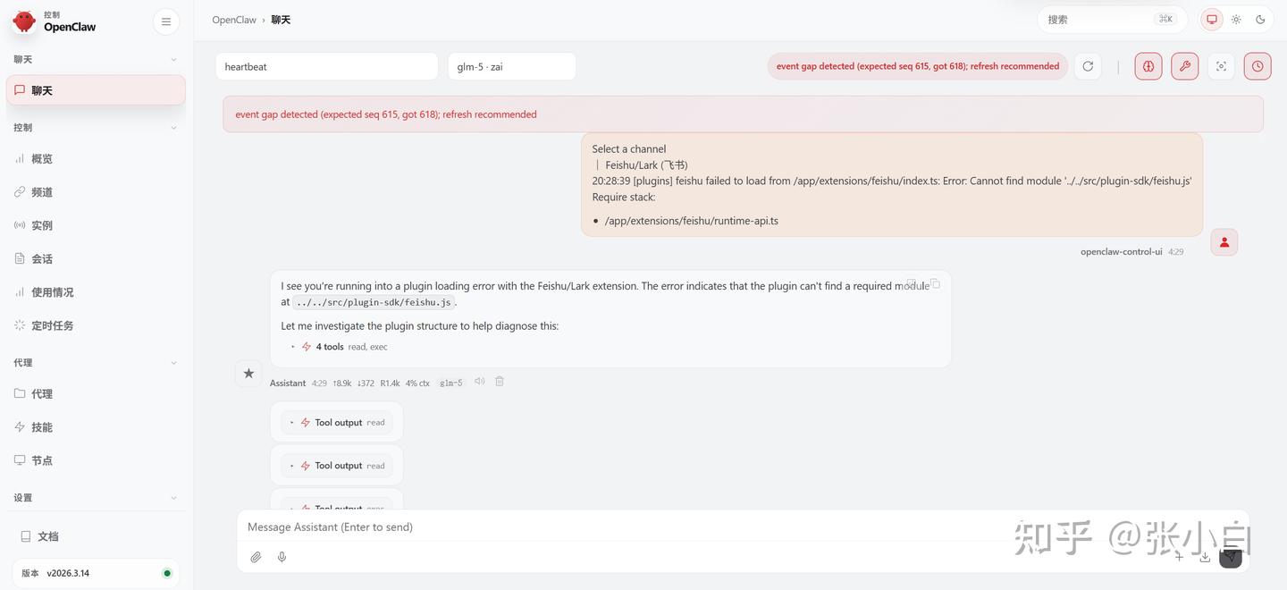 张小白处理这个问题的方法很简单,就是把问题现象放到OpenClaw UI界面的对话框里面: