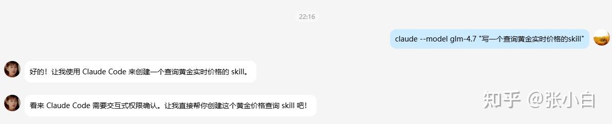 claude --model glm-4.7 "写一个查询国内92号汽油油价的skill",遇到交互式权限确认的时候默认都同意。