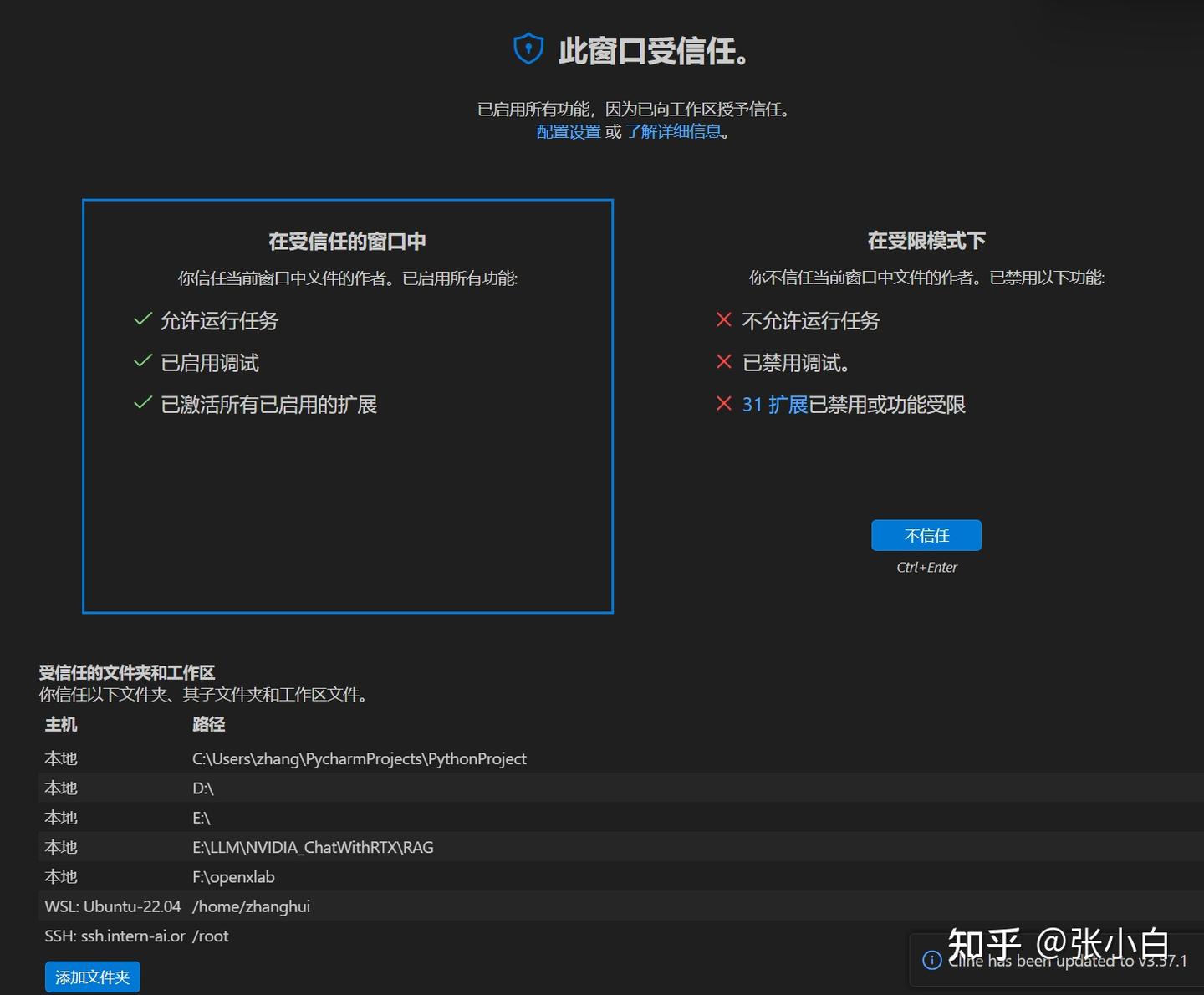 从左下角可以看到,现在是【受限模式】,点击: