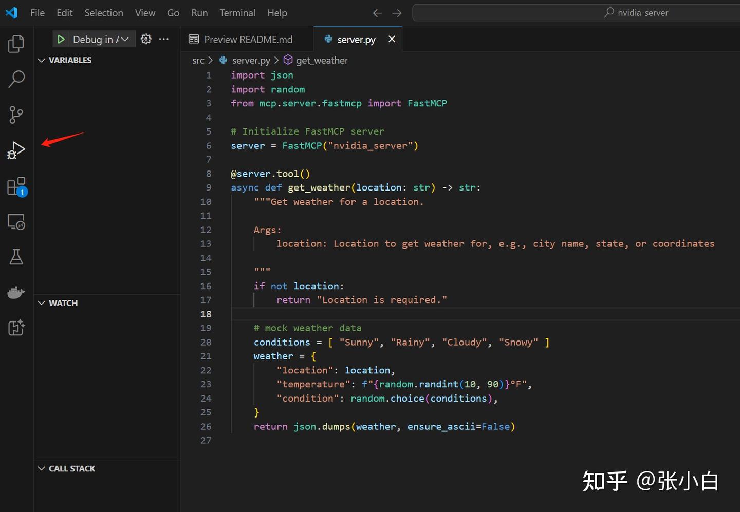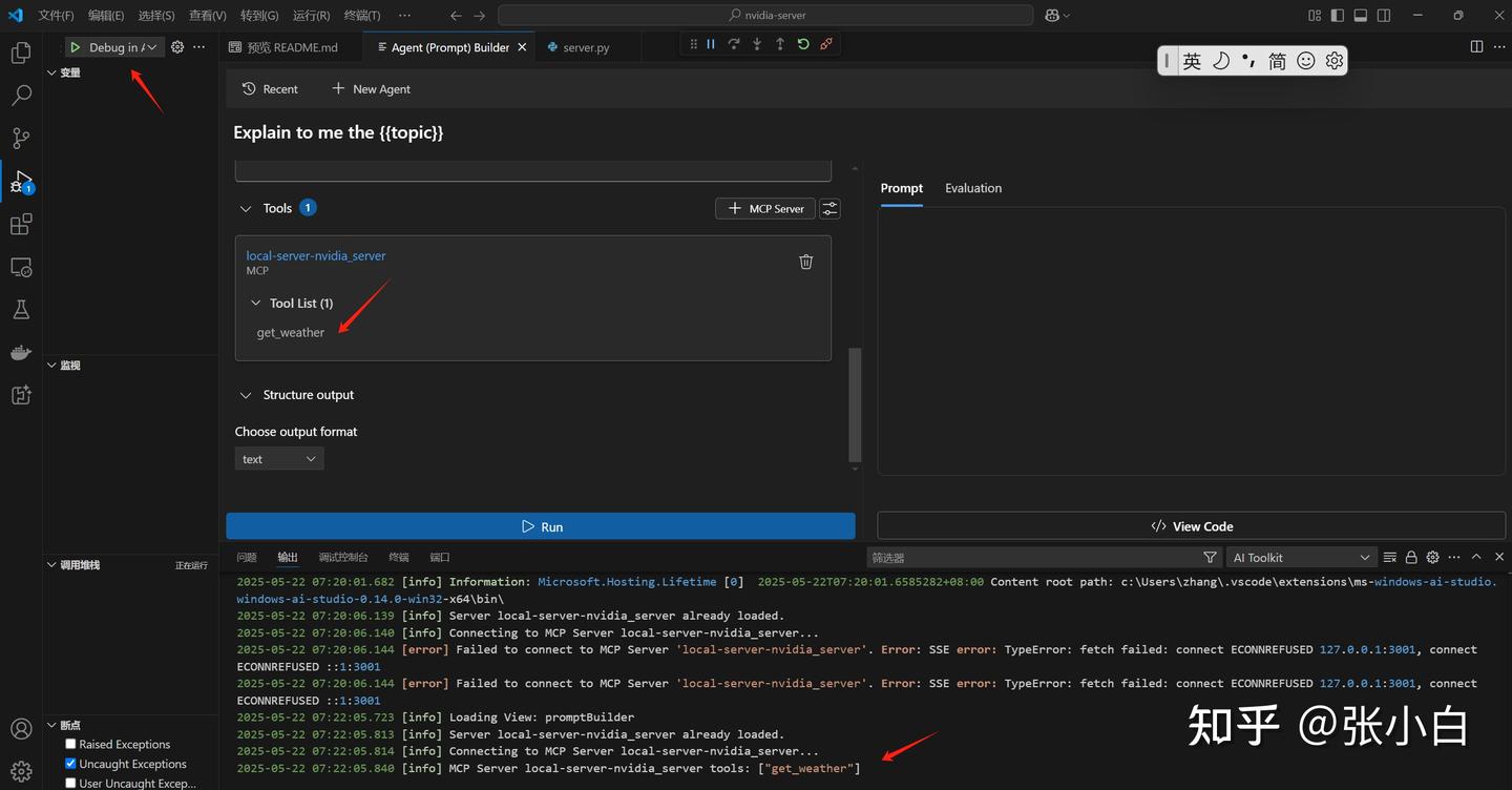 所谓的调试,就是你在启动的程序上输入内容,查看结果,把报错信息贴到对话框里面,等AI解决。