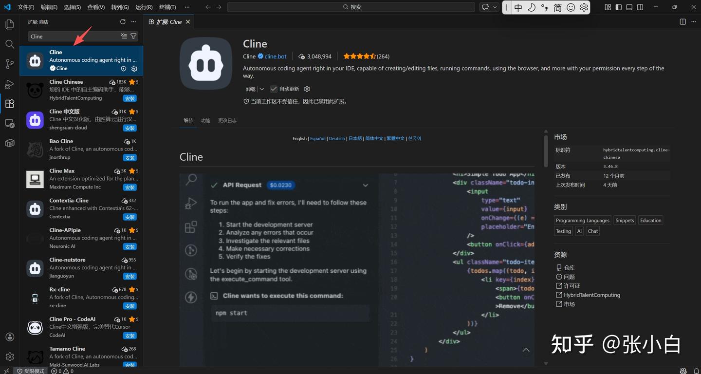 张小白都试过了,而VSCode的插件Cline张小白在以前也尝试过: