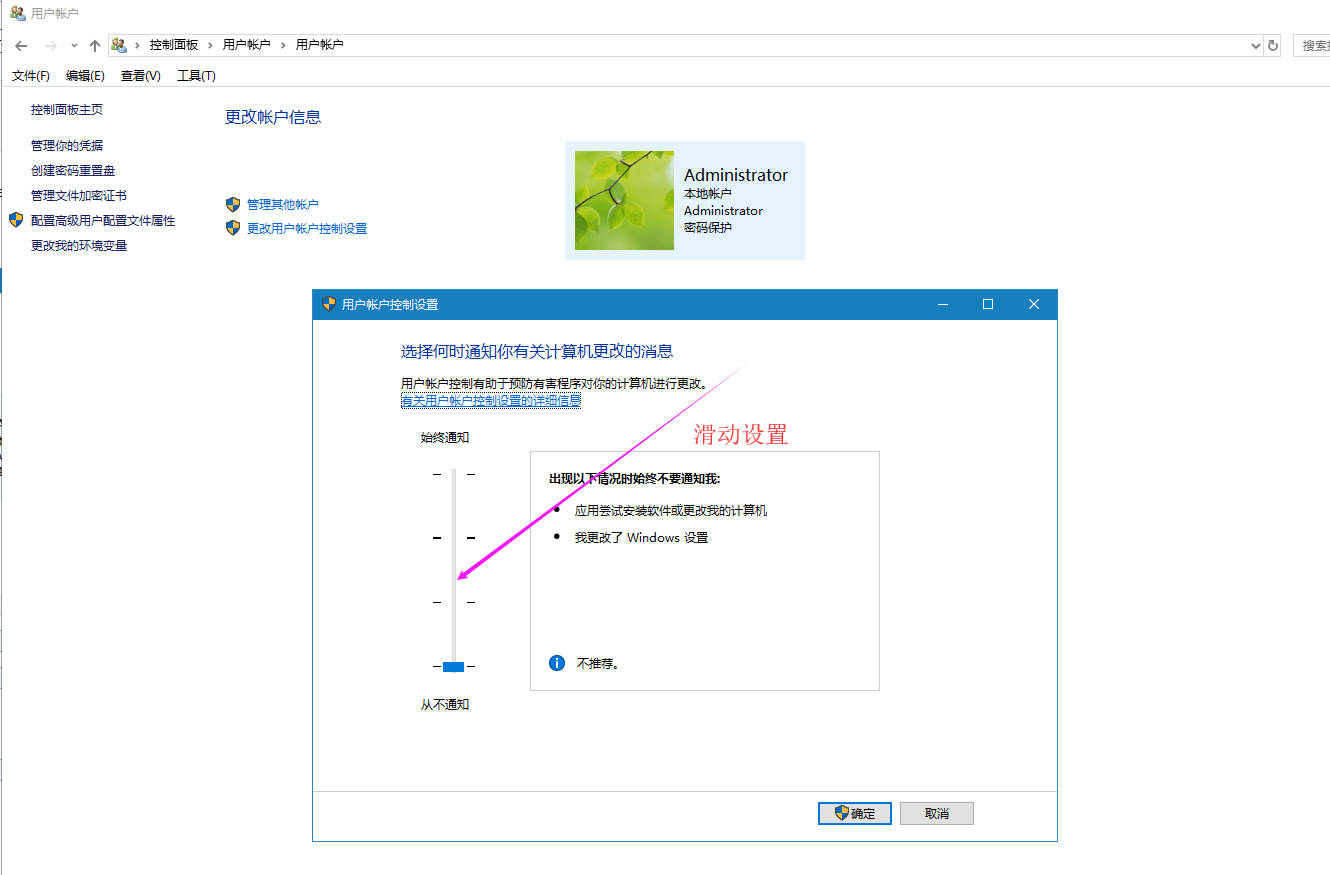 1、控制面板\用户帐户\用户帐户 选择 更改用户帐户控制设置