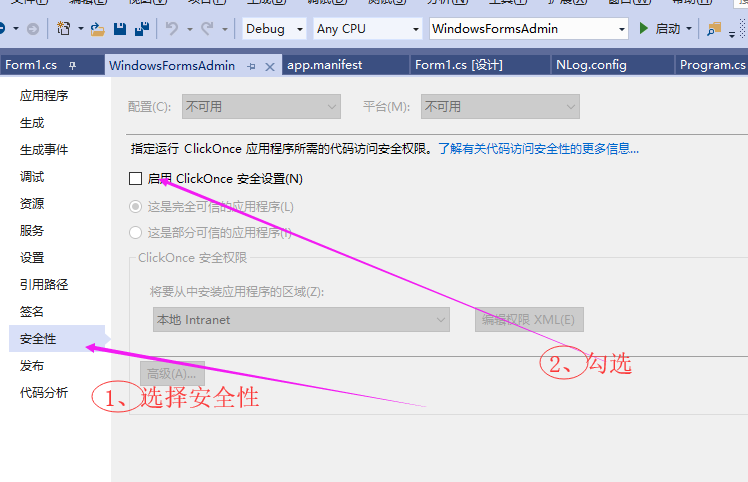 2、可以通过 项目右键 选择 属性 安全性 勾选 启用ClickOnce 安全设置(N) 自动生成一个app.manifest清单文件,然后取消勾选 启用ClickOnce 安全设置(N)
