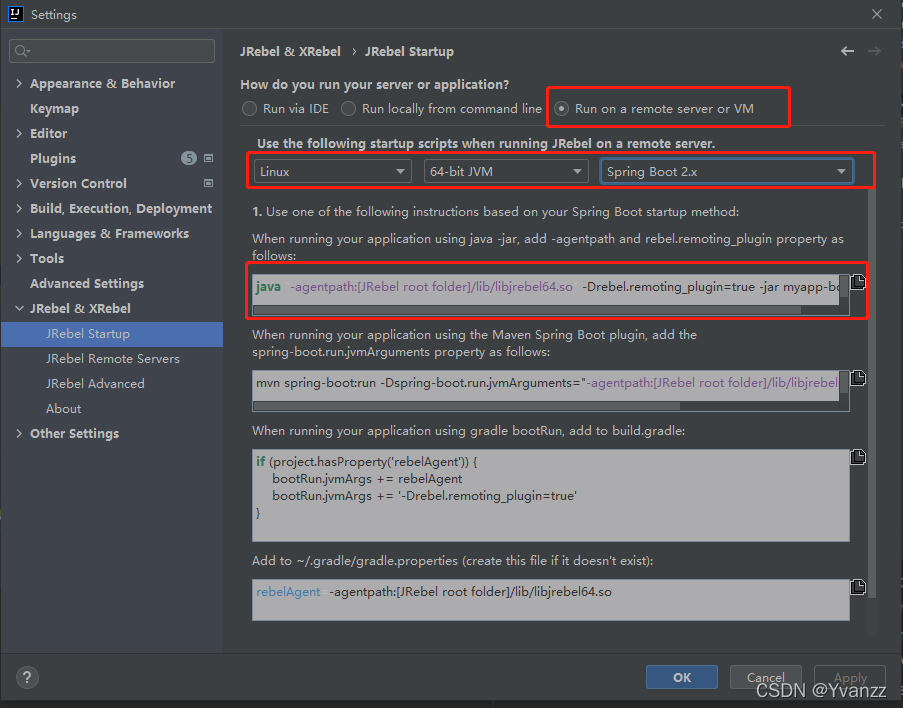 这里有两个地方需要修改,一个是-agentpath:就是刚刚在服务器上安装的JRebel目录,另外一个就是自己的jar包名称