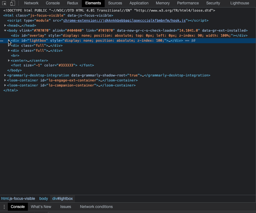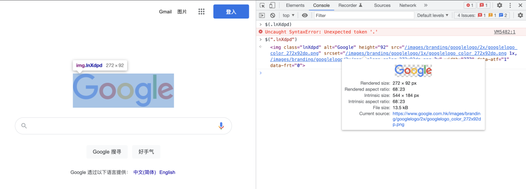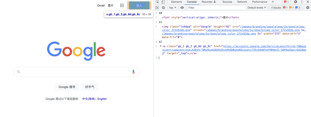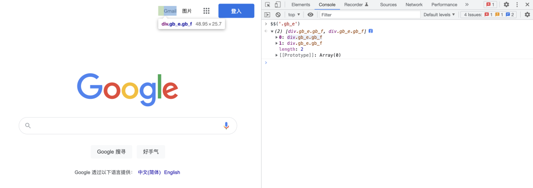 在 Chrome DevTools 的 Console 面板中,可以输入一些带 $ 的命令来选择和检查 DOM 元素。