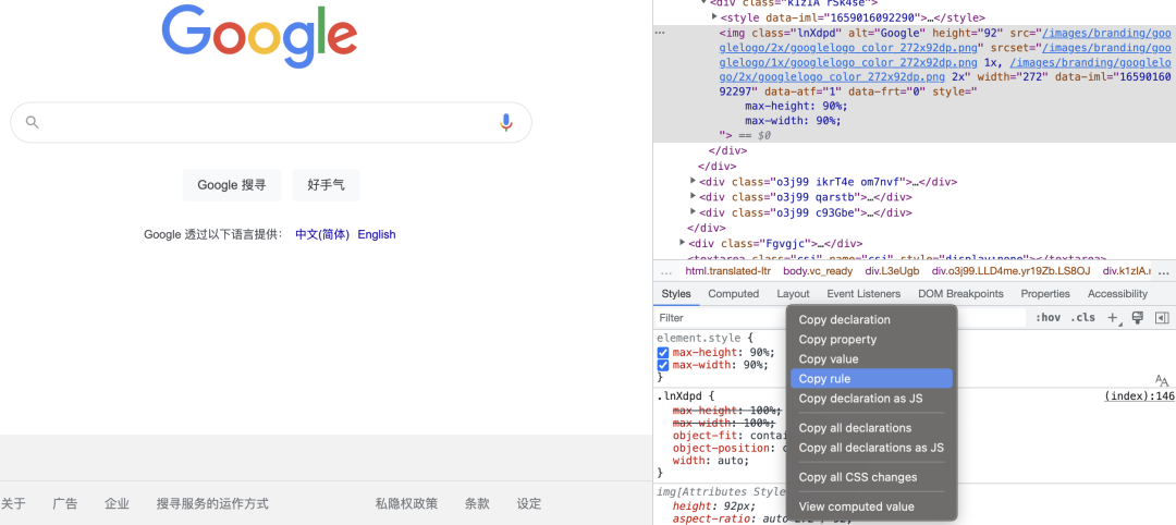 我们可以复制 CSS 规则或声明,甚至可以将内容复制为 JavaScript 键值对:
