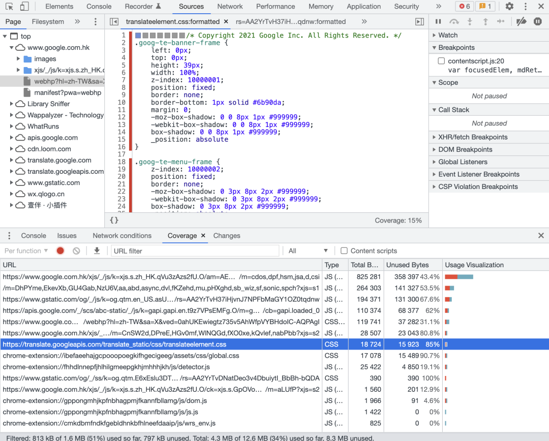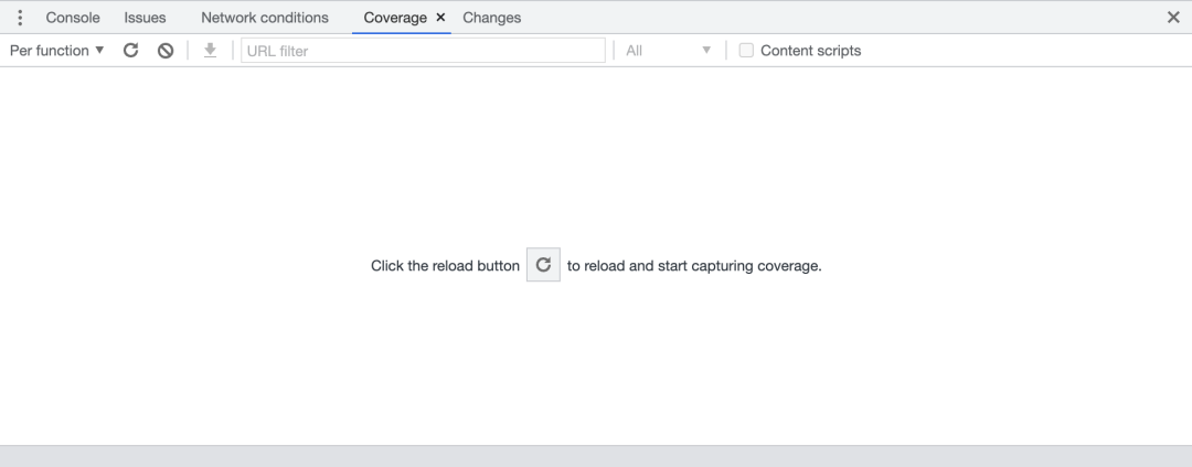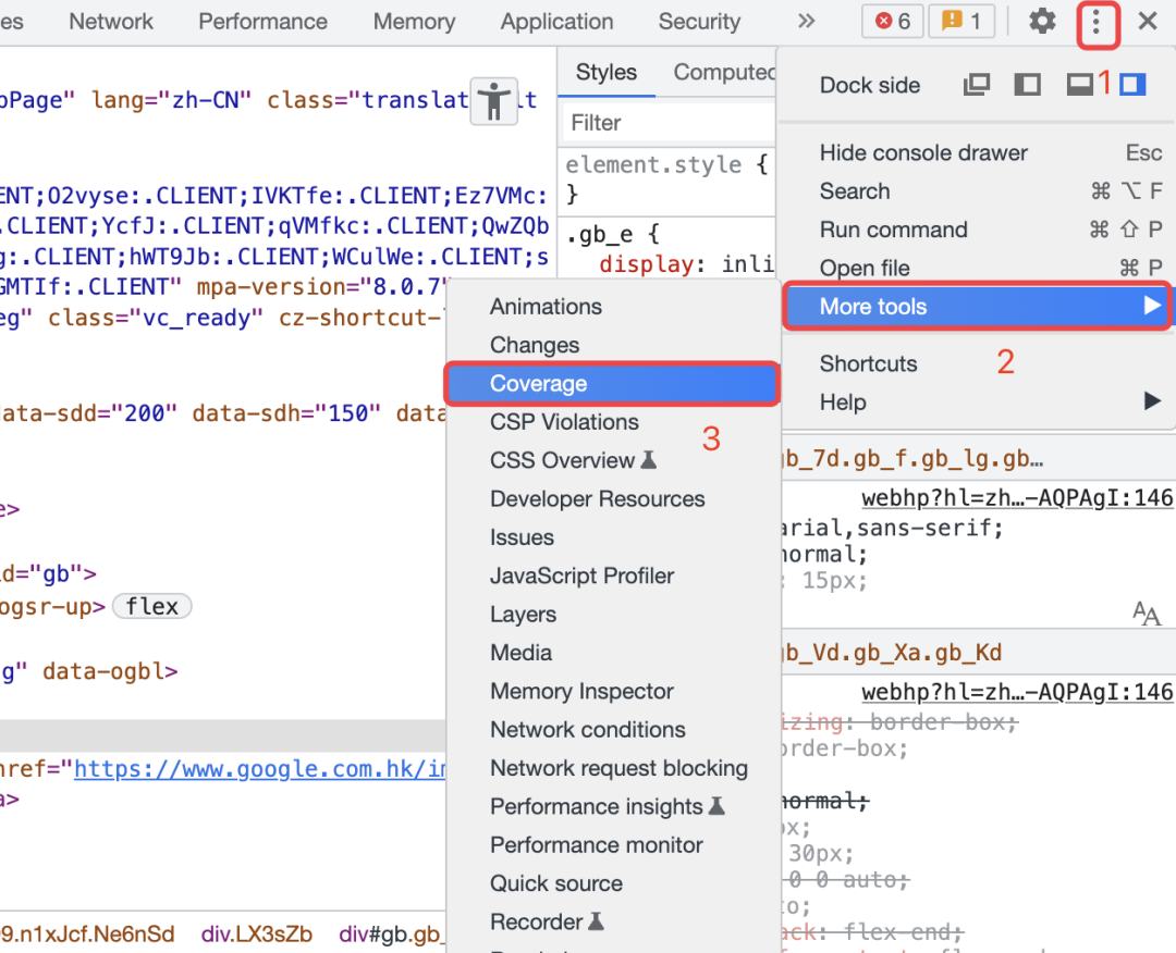 可以在 Coverage 面板中检查页面中没有使用的 CSS 和 JavaScript 代码,可以通过以下步骤来打开 Coverage 面板:
