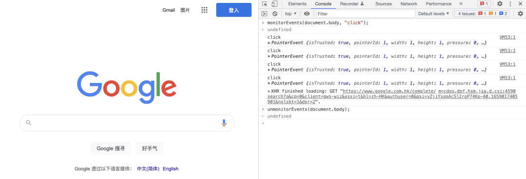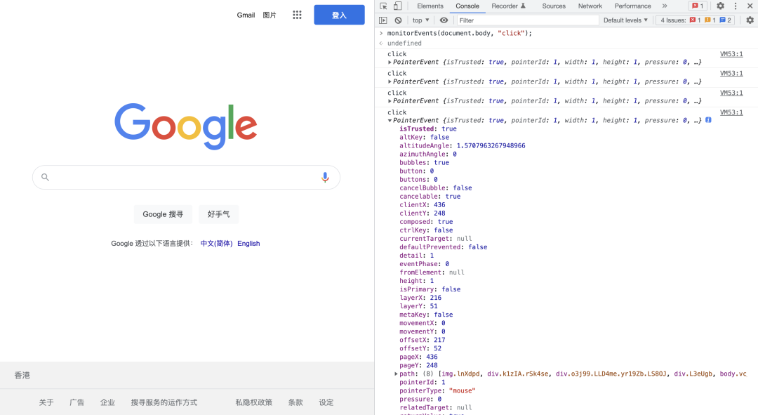 可以在 Chrome Devtools 的 Console 面板中输入 monitorEvents() 来监听指定目标事件的信息。该方法有两个参数,第一个参数是要监听的对象。如果未提供第二个参数,所有事件都会返回。要指定要监听的事件,传递一个字符串或字符串数组作为第二个参数。