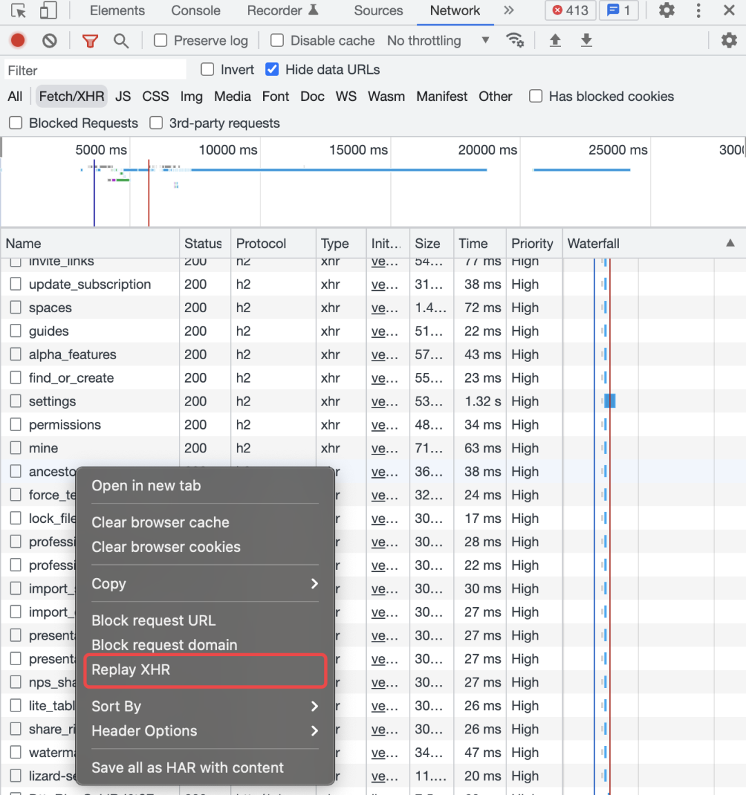 Chrome DevTools 支持重新发送 XHR 请求。在和后端进行接口联调时,如果想要重新发送请求,并且参数保持不变,可以直接右键点击要重新发送的 XHR 请求,点击 Replay XHR 即可重新发送该请求:
