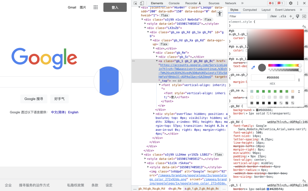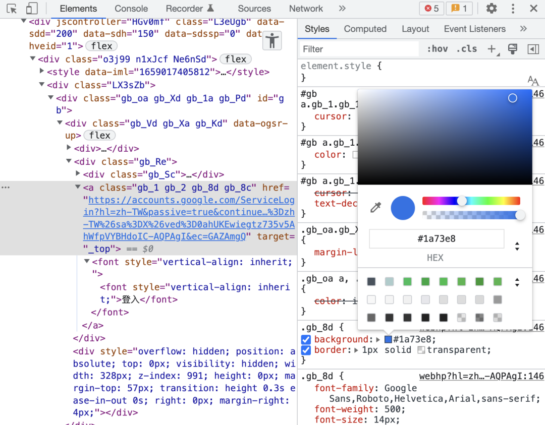 Chrome DevTools 提供了一个颜色选择器来设置背景颜色和文本颜色。颜色选择器具有各种功能:颜色选择器具有各种功能,例如