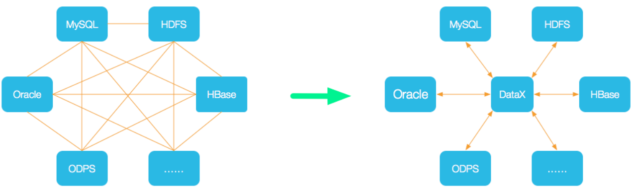 DataX将复杂的网状的同步链路变成了星型数据链路,DataX作为中间传输载体负责连接数据各种数据源。