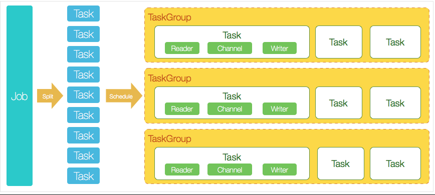 - 每一个Task都由TaskGroup负责启动,Task启动后,会固定启动Reader—>Channel—>Writer的线程来完成任务同步工作。