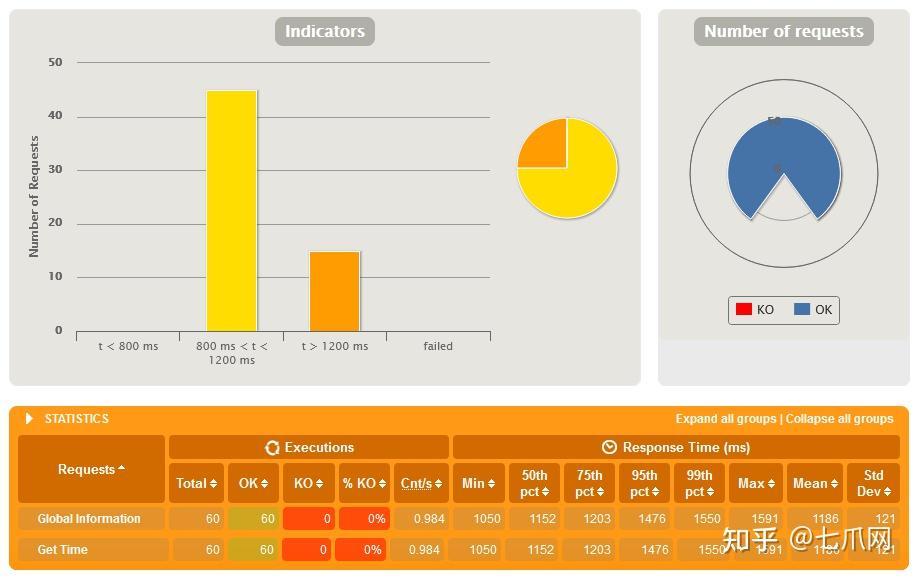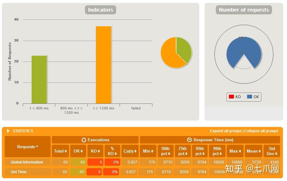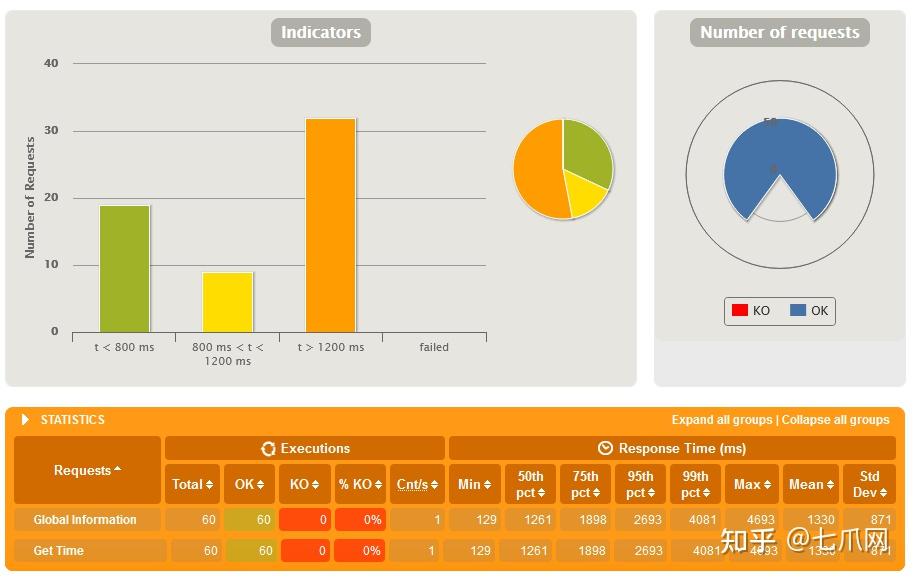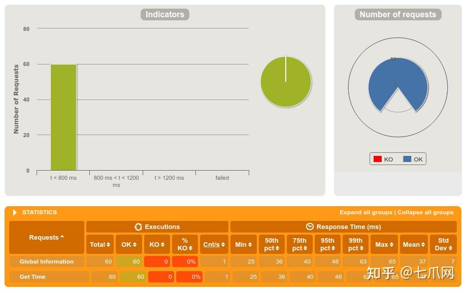 Gatling 的基本案例图表显示了一个健康的系统。 60 个请求,没有失败,99% 的响应时间为 63 毫秒——还不错。