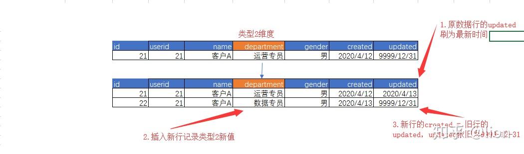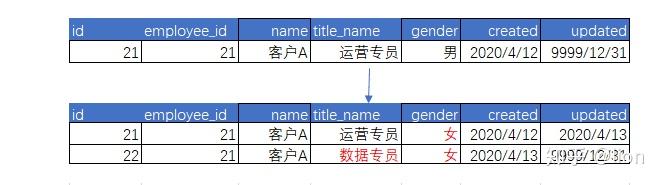- 新增一行记录,记录最新的数据,created为最新时间,updated为 9999-12-31