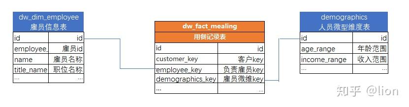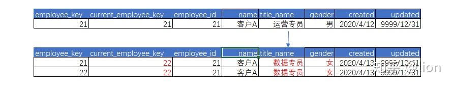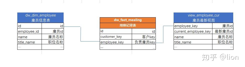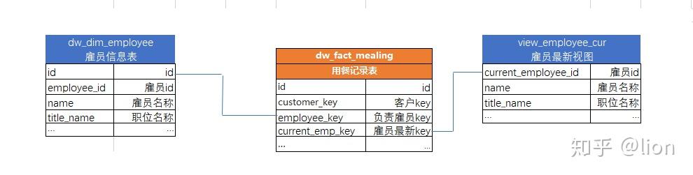 这么一来,如果想要了解雇员在用餐发生瞬间历史的状态,关联至左边的维度表即可得知;如果想要以雇员最新的状态进行分析。则直接取右边的表即可。