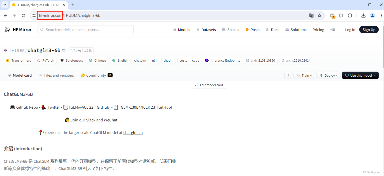 要改成:https://hf-mirror.com/THUDM/chatglm3-6b,即可访问,如下图: