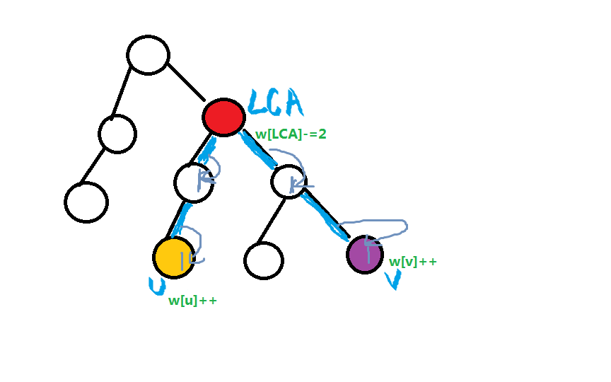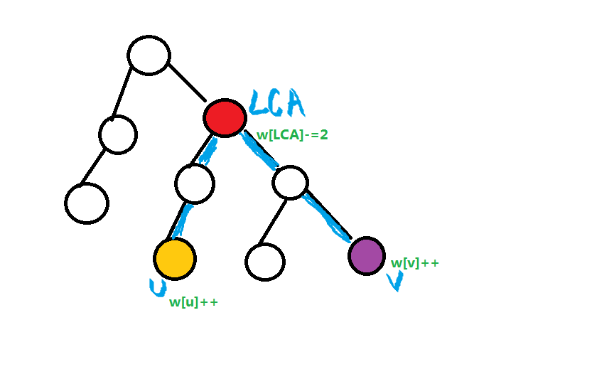 u-->LCA,就要把w[u]++,w[LCA]--; 然后是LCA-->v,把w[v]++,w[LCA]--;合起来,就是w[u]++,w[v]++,w[LCA]-=2.