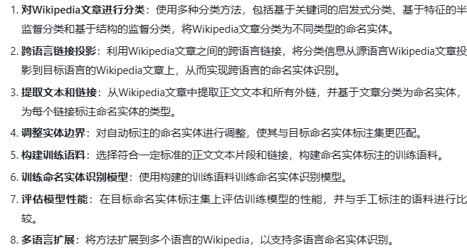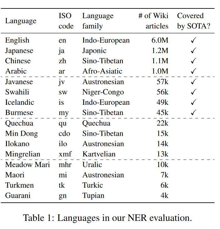 - 尽管我们只针对已有命名实体识别(NER)语料库的语言进行了评估,但我们的成果表明它们可以应用于维基百科所涵盖的许多资源匮乏的语言。