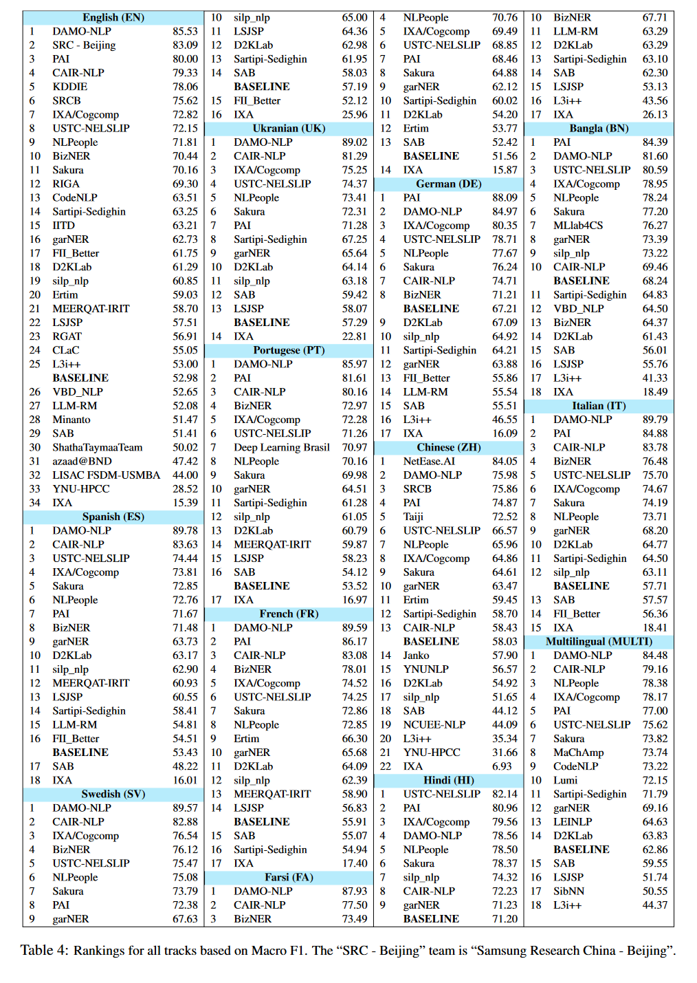 评测(部分):DAMO-NLP(Tan等人,2023年)在大多数赛道中排名第一,除了在BN、DE、ZH和4个基线中排名第二,在HI中排名第四。他们为这项任务提出了一个统一的检索增强系统(U-RaNER)。该系统使用两种不同的知识来源(维基百科段落和Wikidata知识图谱)向他们的命名实体识别(NER)模型注入额外的相关知识。此外,他们探索了一种注入方法,向模型提供关于实体的更广泛的上下文知识。PAI(Ma等人,2023b)在BN、DE中排名第一,在FR、HI中排名第二,在EN、ZH中排名第三,在MULTI中排名第四,在ES、FA、UK和SV中排名第七,在PT中排名第八。他们使用来自Wikidata的实体及其相关属性(如“instanceof”、“subclassof”和“occupation”)开发了一个知识库。对于给定的句子,他们使用检索模块通过字符串匹配收集实体的不同属性。他们通过字典融合方法在干净子集上观察到了好处。在嘈杂子集上没有观察到同样的好处。USTC-NELSLIP(Ma等人,2023a)在HI中排名第一,在BN、ES中排名第三,在DE、UK中排名第四,在IT、SV中排名第五,在FA、FR、PT、ZH、MULTI中排名第六,在EN中排名第八。他们提出了一个两阶段训练策略。在第一阶段,通过最小化他们之间表示的KL散度,调整地理名录网络和语言模型在句子和实体层面的表示。在第二阶段,两个网络一起在NER目标上进行训练。最终预测来自多个训练模型的集成。结果表明,地理名录在NER过程中准确识别复杂实体中发挥了关键作用,实施两阶段训练策略是有效的。NetEase.AI(Lu等人,2023年)在ZH中排名第一。他们提出的系统由多个模块组成。首先,使用BERT模型纠正原始输入句子中的任何潜在错误。NER模块以校正后的文本为输入,包括一个基本的NER模块和一个地理名录增强的NER模块。这种方法提高了在实体级别噪声上的性能,并使系统在其他团队中获得了明显优势(表11)。检索系统以候选实体为输入,检索额外的上下文信息,随后用作文本分类模型的输入,以计算实体类型标签的概率。一个堆叠模型被训练,根据多个模块的特征输出最终预测。