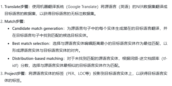 资源:机器翻译系统:利用Google Translate将源语言(英语)的NER数据集翻译成目标语言的数据集,以获取目标语言的无标注数据集。