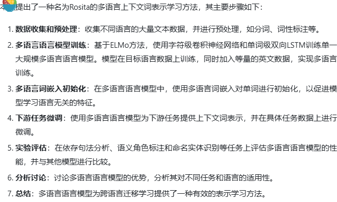 这篇文章介绍了一种名为Rosita的方法,用于生成多语言上下文词表示。Rosita方法通过在多语言语料上训练单一语言模型来实现。文章进行了跨语言转移实验,比较了单语言和多语言模型在依存句法分析、语义角色标注和命名实体识别任务上的表现。结果显示,多语言上下文词表示优于单语言表示,即使在语言差异较大的情况下,如中文到阿拉伯语,多语言模型仍能提供额外的收益。这项研究为多语言表示学习提供了有价值的证据。