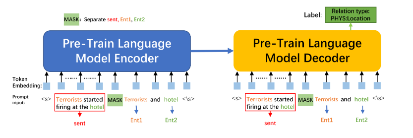 关系提取的微调:给定一个用于RE的预训练语言模型(PLM) M。早期的微调方法首先将实例x = {e1, e2, e3, es, ...., eo, ....., en}转换为PLM输入序列,例如“ x ”。模型M的输出隐藏向量将输入序列编码为venc = {v, v1, v2, vs, ...., vo, ....., v}。然后输入venc和“ x ”到模型M的解码器中以获得vdec。下面的公式表示关系类型y的条件概率:p(y|x) = Softmax(Wvdec)。