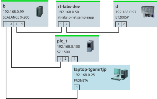PROFINET设备支持网络拓扑检测功能,诸如[PRONETA](# 附录-PRONETA网络分析工具)等网络工具软件可以通过询问设备的方式,获取设备的网络连接信息,从而绘制网络图。
