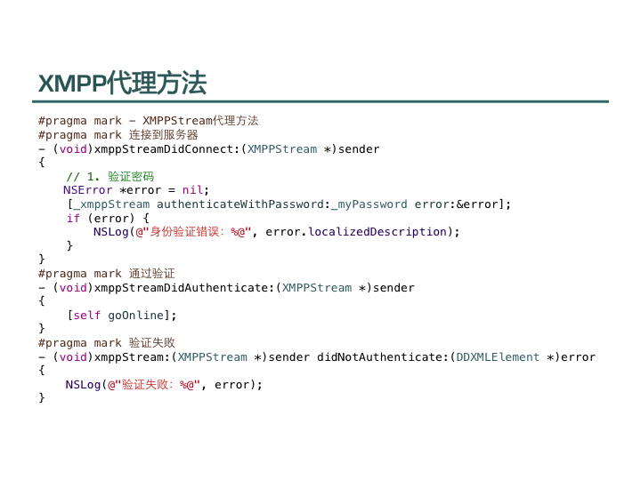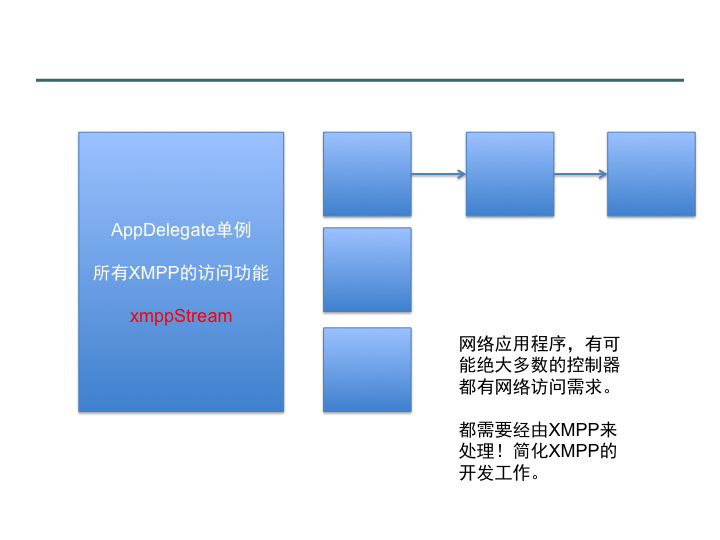• 为了简化开发,XMPP的引用程序通常会将XMPPStream放置在