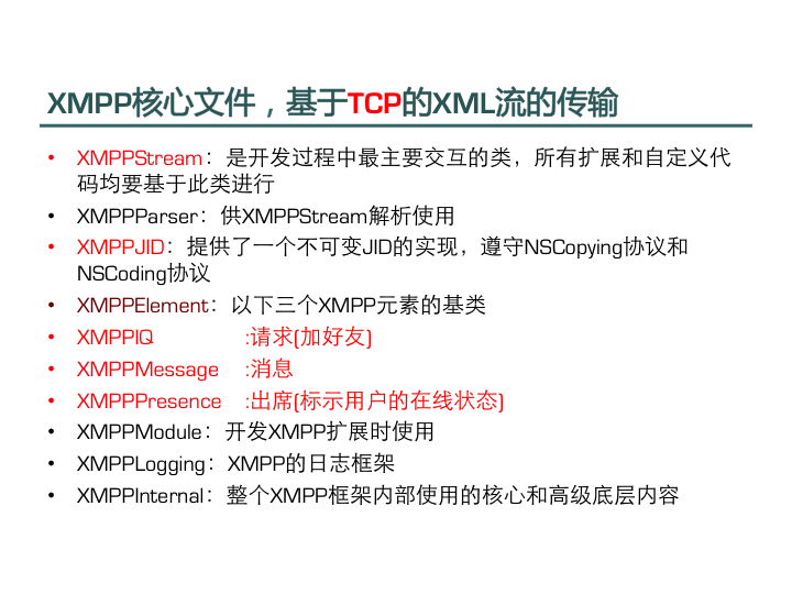 • XMPPInternal:整个XMPP框架内部使用的核心和高级底层内容