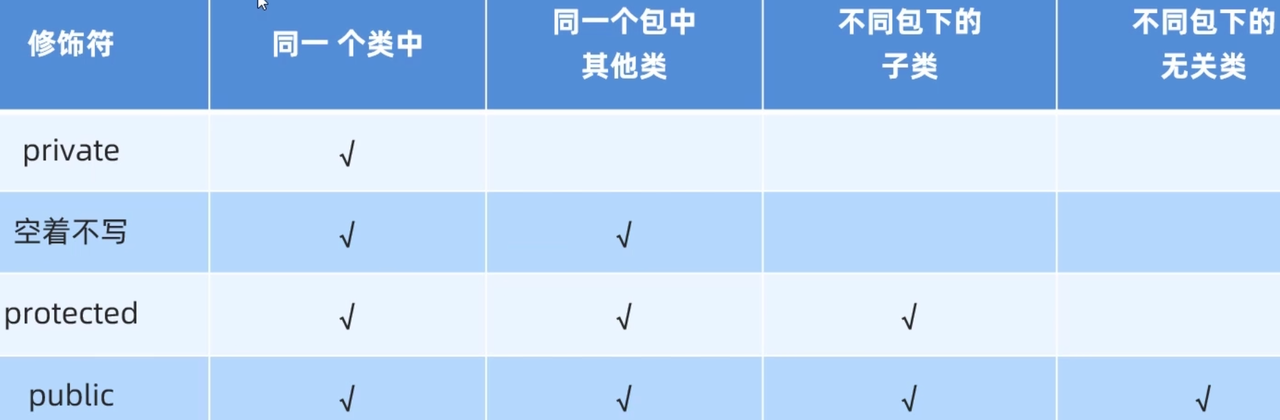 四种权限修饰符, 作用范围由小到大依次为: private < 空着不写 < protected < public