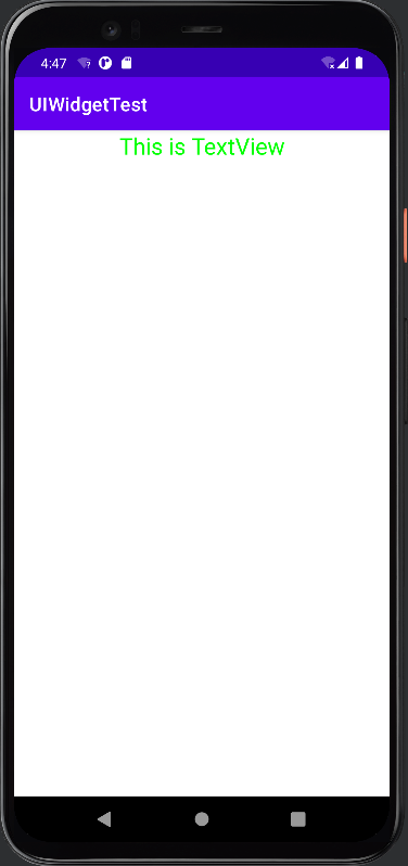 虽然指定的文本内容正常显示了, 不过我们好像没看出来 TextView 的宽度是和屏幕一样宽的。其实这是由于 TextView 中的文字默认是居左上角对齐的,虽然 TextView 的宽度充满了整个屏幕,可是由于文字内容不够长, 所以从效果上完全看不出来。现在我们修改 TextView 的文字对齐方式, 如下所示: