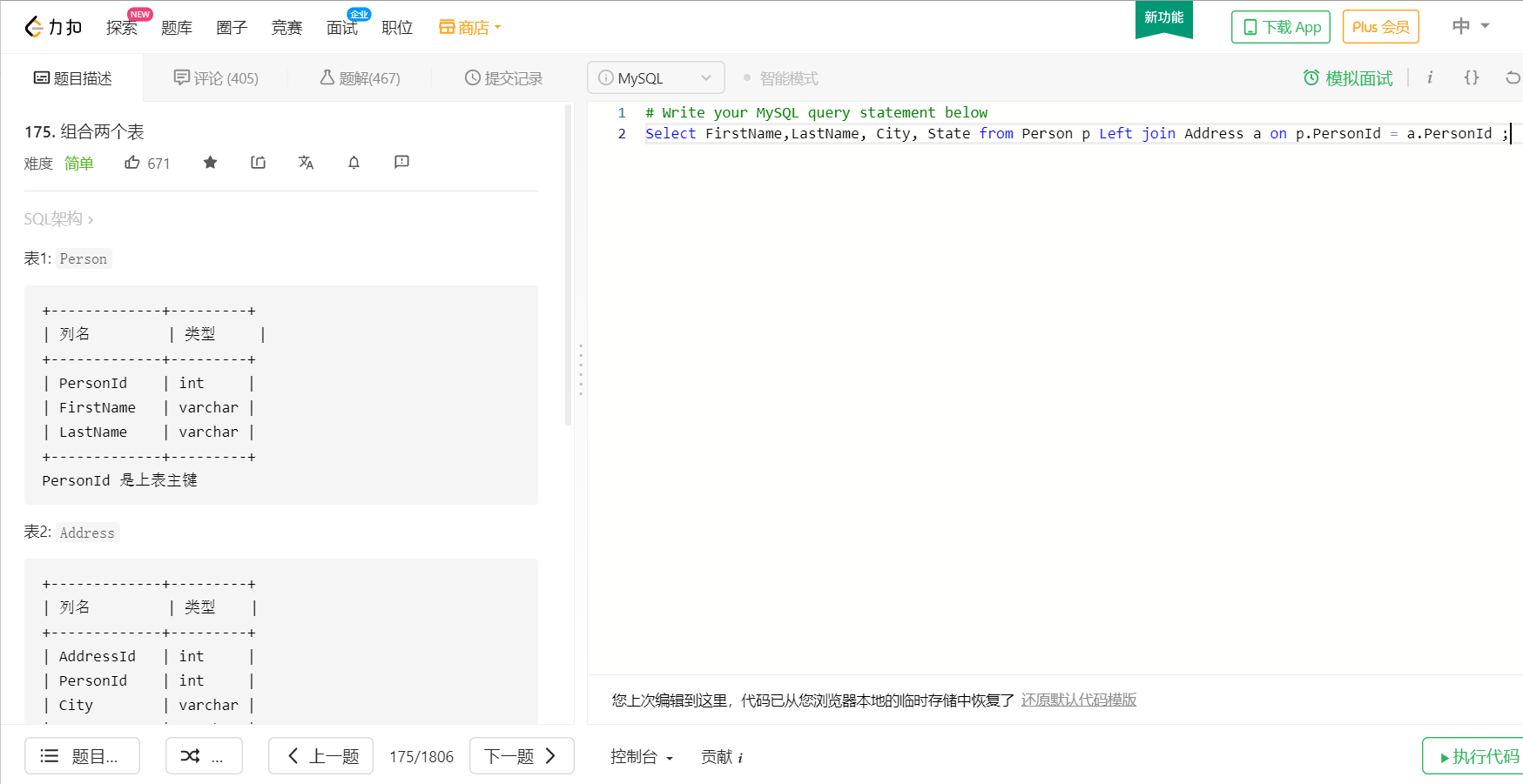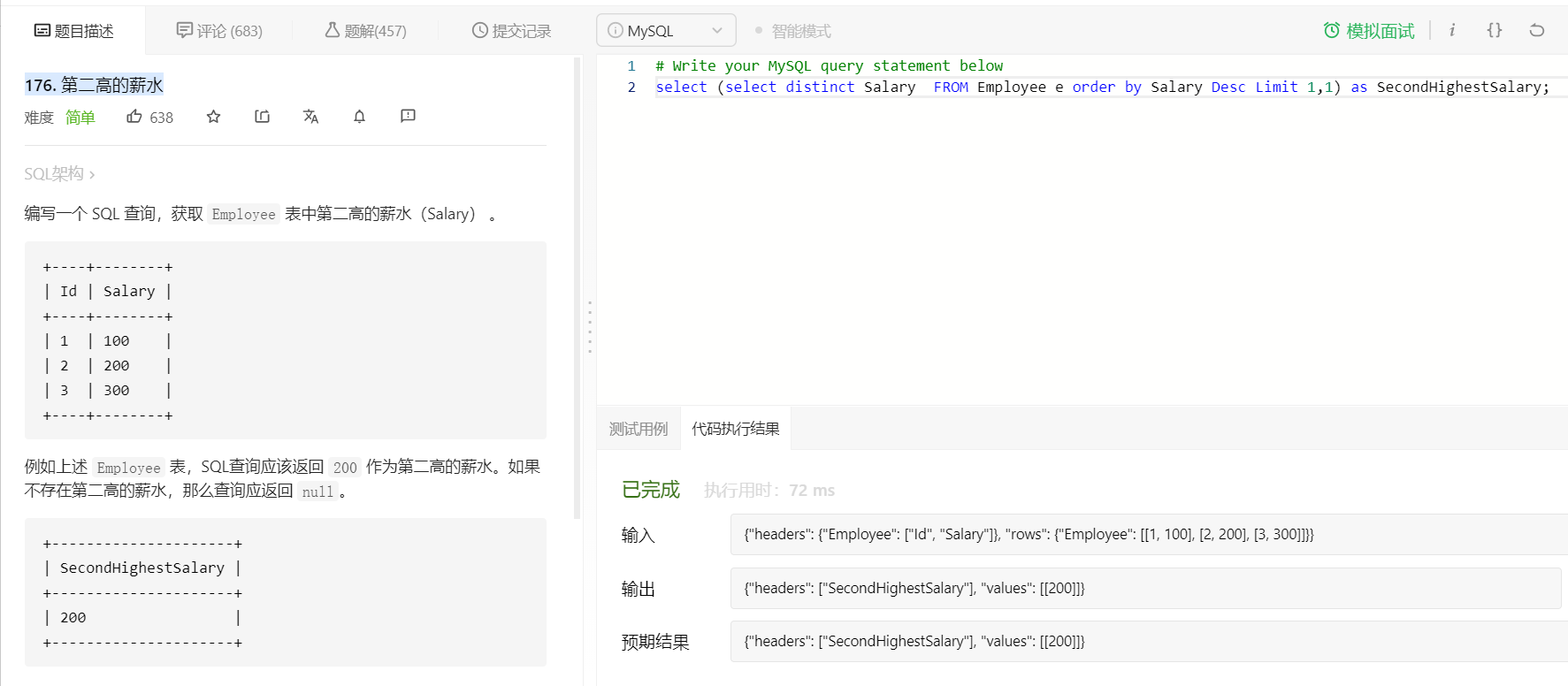 175. 组合两个表 sql 176. 第二高的薪水 sql